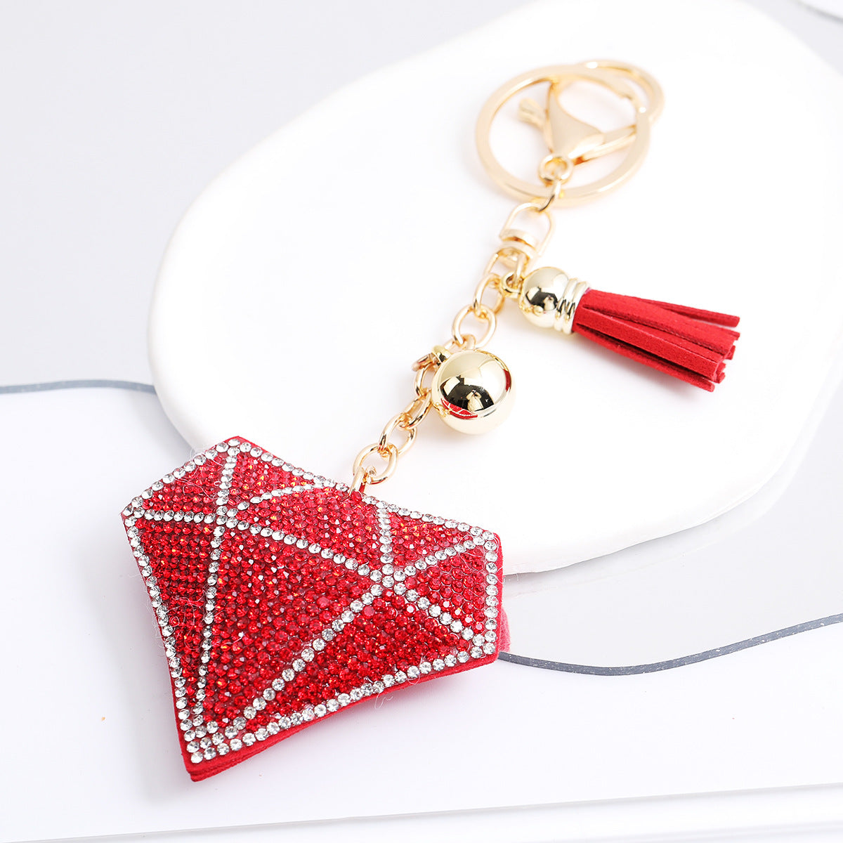 Stylish Design: Features a love heart shape with diamond accents and elegant tassels, perfect for adding a chic touch to bags and keys.